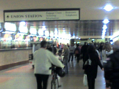 這是我在Union Station裡面偷照那位一直奔跑的男主角,Dylan Bruno,他今天真的一直不停的跑,而且那提帶裡面裝的都是木塊,很重耶!因為他會把提帶丟到地上,所以一定要有重量,還真辛苦啊!