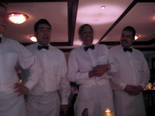 進了餐廳大門後,下了三層樓梯,才來到餐廳,這時餐廳還沒有很多人,不過八點多開始,越來越多人來用餐,怎麼大家吃飯都吃這麼晚?餐廳裡面非常昏暗,所以真的挑戰我在黑暗中照相的功力啊!不過這種昏暗的餐廳,感覺真的蠻羅曼蒂克的。