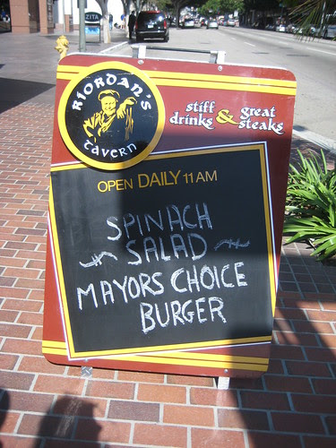 門口的看板上寫著當天的推薦菜色,那個「市長推薦漢堡」,服務生說裡面夾的漢堡肉足足有一磅,是誰可以吃得下那麼大的漢堡啊?