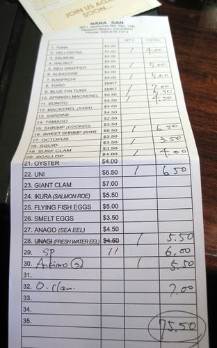 Dr. P went on a business trip to Utah for 3 weeks. We planned to have a nice dinner together the day before he left. Dr. P wanted Japanese, so I suggested Nana San. I passed by the restaurant on my way to the animal hospital where I interned at. The name Nana San means "seventy three" in Japanese. I thought it was unique, and looked the restaurant up when I got http://www.eileenlikestoeat.com. Nana San has great review on Yelp. A lot of people raved about their omakase. When Dr. P heard "omakase", he said "let's go!"
