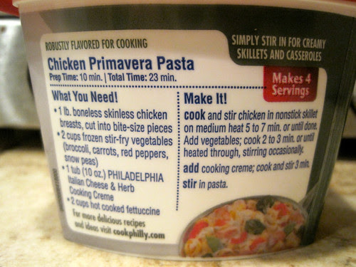 There's a recipe for a very similar pasta in the back. I made it pretty much the same way. But I didn't use the whole tub, and I also added lemon juice to the sauce.